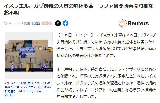 [26日 ロイター] - イスラエル軍は26日、パレスチナ自治区ガザに残っていた最後の人質の遺体を収容したと発表した。トランプ米大統領が掲げるガザ戦争終結計画の初期段階の重要条件が満たされた。