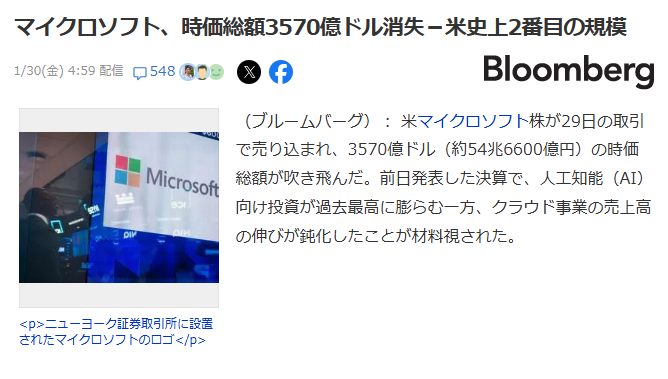 マイクロソフト、時価総額3570億ドル消失-米史上2番目の規模